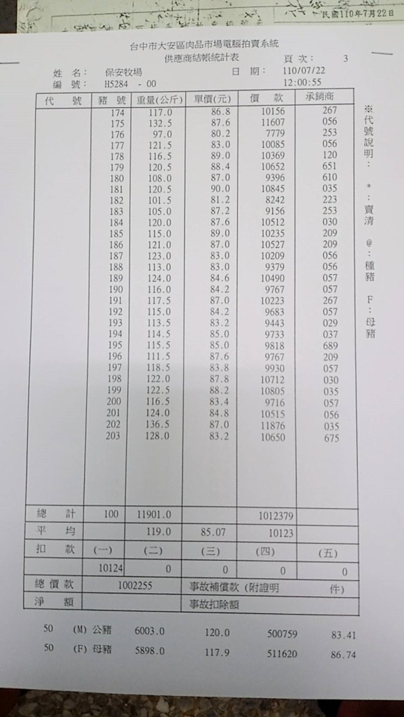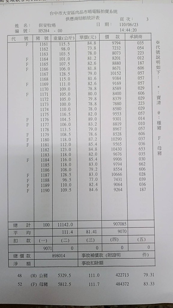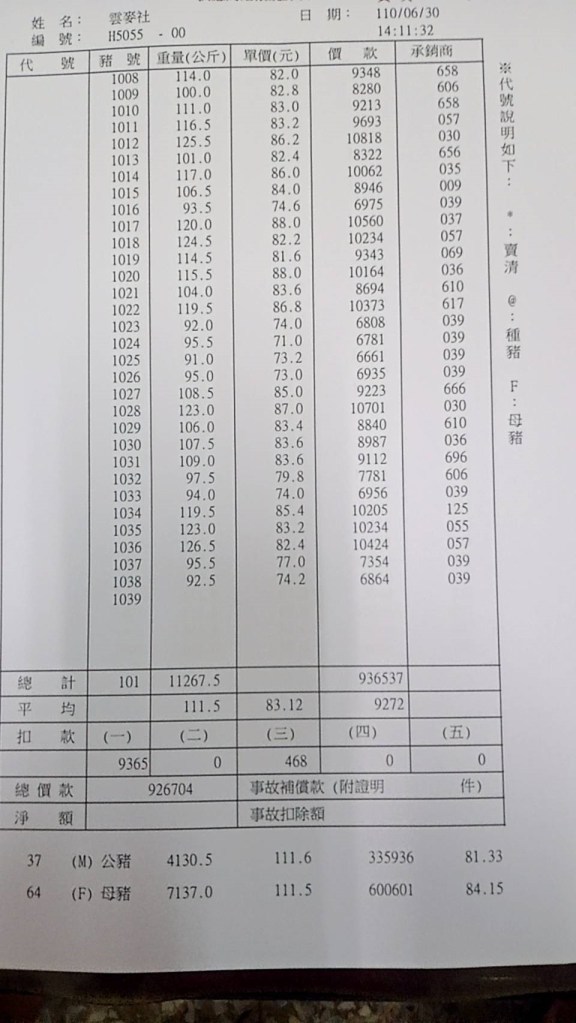 | 日期 | 出售頭數 | 公母比例 | 總重量(kg) | 平均重量(kg) |